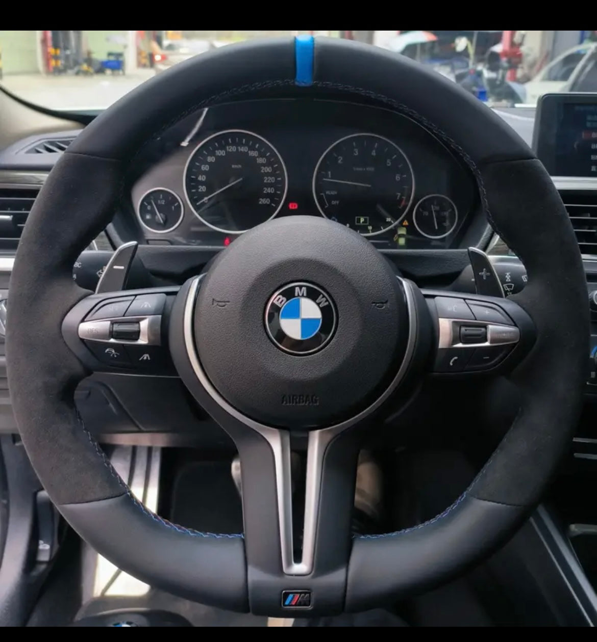 The Pro steering wheel lends an unmistakable motorsport feel to the car's cockpit. Its appeal is twofold: a distinctive and exciting design and a well-defined Alcantara grip area which ensures optimal grip at all temperatures. With motorsport steering-wheel centre mark in light blue leather. Will fit most F87 M2, F80 M3, F82/F83 M4 Vehicles but please give us a call or Message to confirm compatibility.